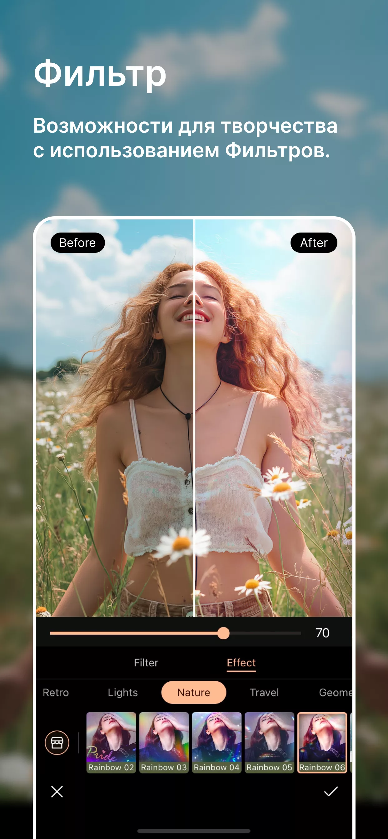 - Эффекты и фильтры. Более 200 различных эффектов и фильтров, позволяющих создать уникальный стиль для ваших фотографий.