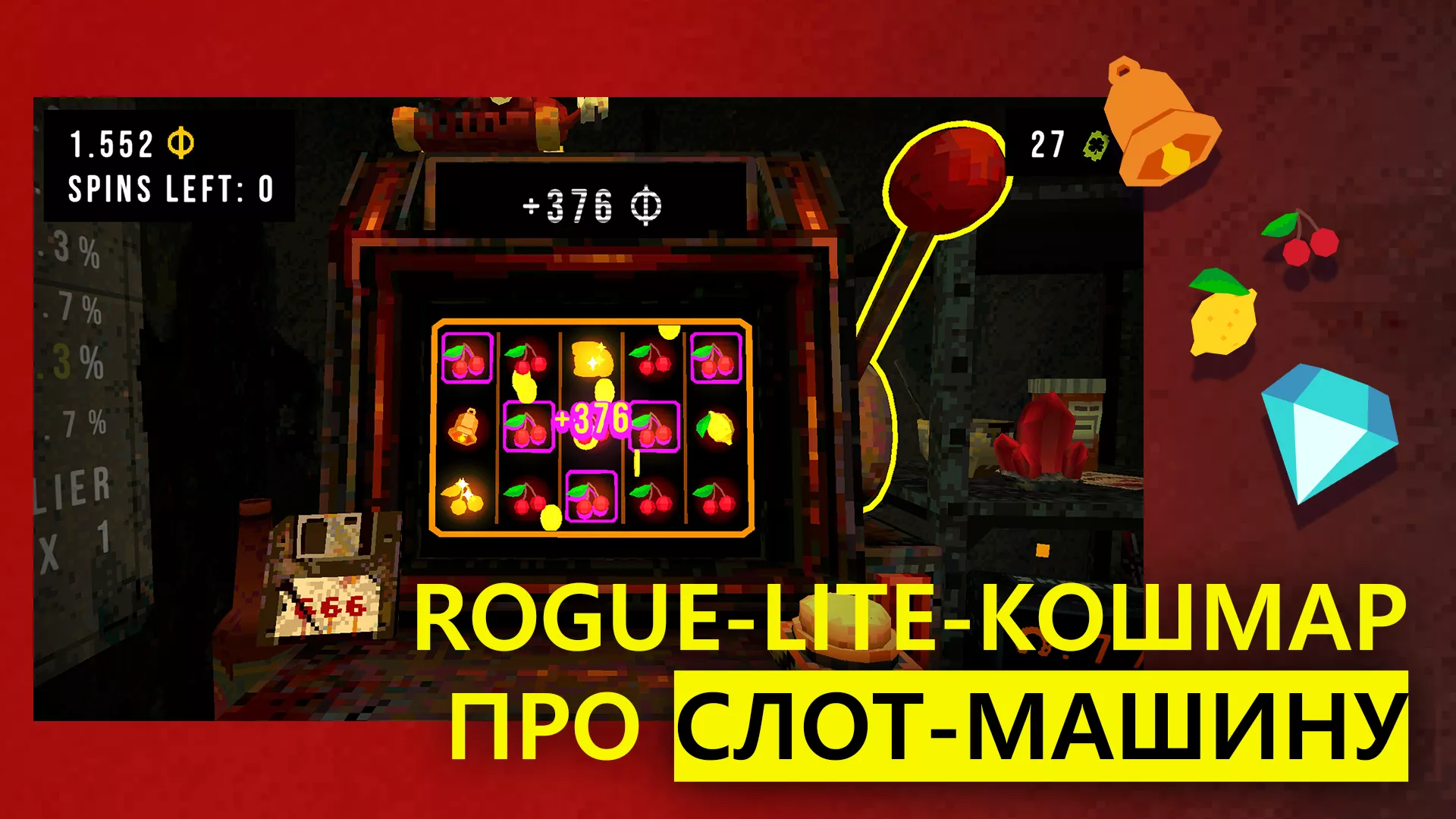CloverPit — стратегическая игра в жанре roguelike с игровым процессом, основанным на игровых автоматах. Объекты представляют собой 3D-модели в классической графике с небольшим количеством полигонов. Детали объектов также относительно просты.