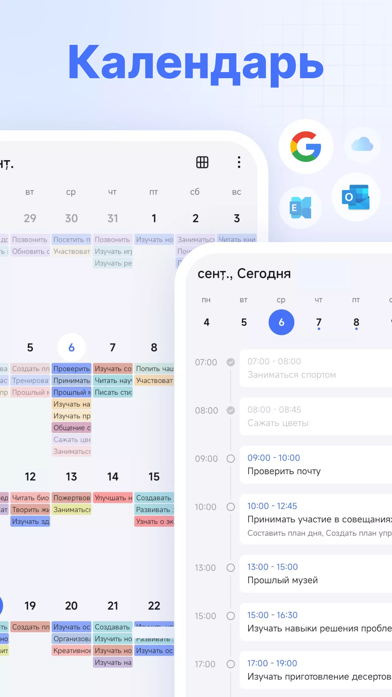 - задачи также синхронизируются и подключаются к другим сторонним календарям, таким как Google Calendar, Outlook.