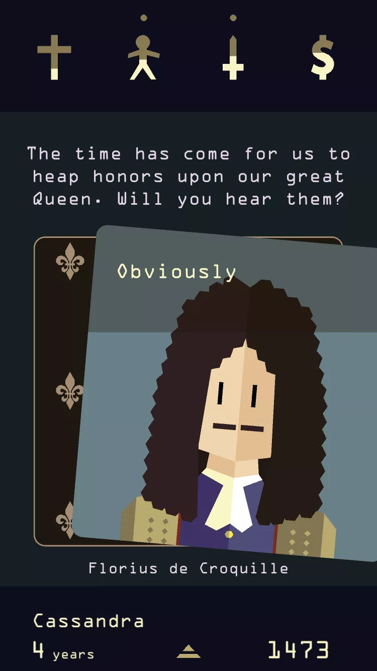 Reigns: Her Majesty is the second installment of the kingdom management strategy game. The country is experiencing a cultural renaissance, a triumph of knowledge and enlightenment. However, the greed and envy of the courtiers still hinder the magnanimous queen.