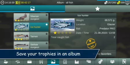 - Album for storing trophies and viewing detailed information about where, when, and what they were caught with